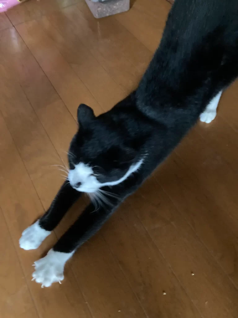 First comes the legendary big stretch — back arched, paws extended, tail up like a victory flag. This one stretch carries the energy of someone who slept 12 hours and is still tired.